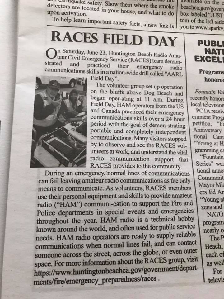 On Saturday May 6th 2023, Huntington Beach RACES (HBRACES) was activated to perform an (annual) 8 hour "shadow drill" with Huntington Beach Fire Department (HBFD). This was a failure simulation of the Orange County 800 MHz fire dispatch system. Over 20 HBRACES members were deployed to Huntington Beach Emergency Operations Center 911 dispatch (EOC), Fire Dispatch Operations Center (FDOC) and an assigned member on each apparatus/vehicle at every fire station within the City.
