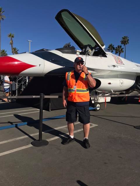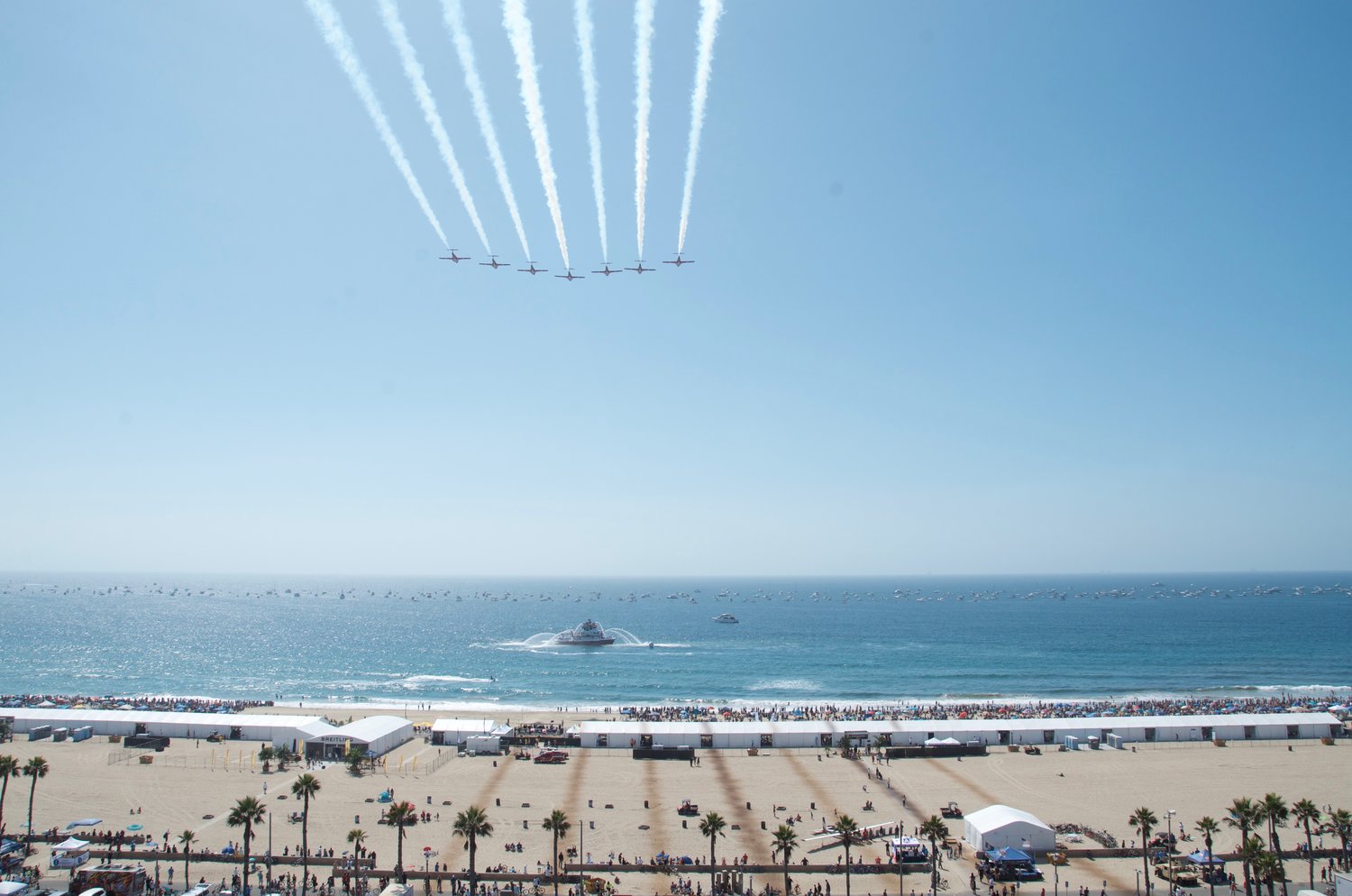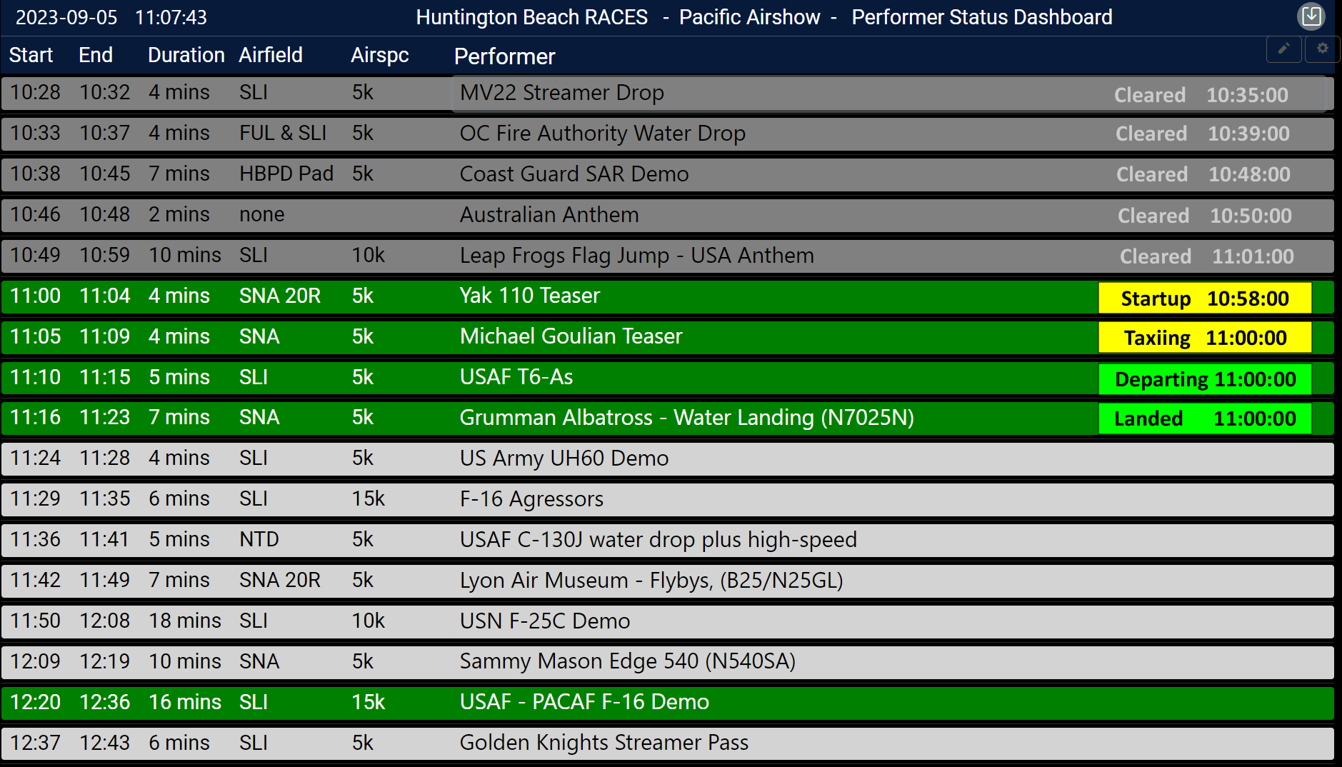 Huntington Beach RACES provides several important communications related functions for the Pacific Airshow. Their responsibilities include general safety awareness as additional "eyes and ears" in the crowds, providing health and welfare communications and emergency requests for the CERT first aid tents. Additionally, HB RACES provides direct show communications links from both John Wayne airport and the Joint Forces Training Base Los Alamitos to the air boss located on the beach. HB RACES tracks detailed performer status on a real-time dashboard that is utilized by emergency personnel in the event command post and beach side by air show operations. HB RACES enlists nearly 30 volunteers each day of the show providing vital communications links.