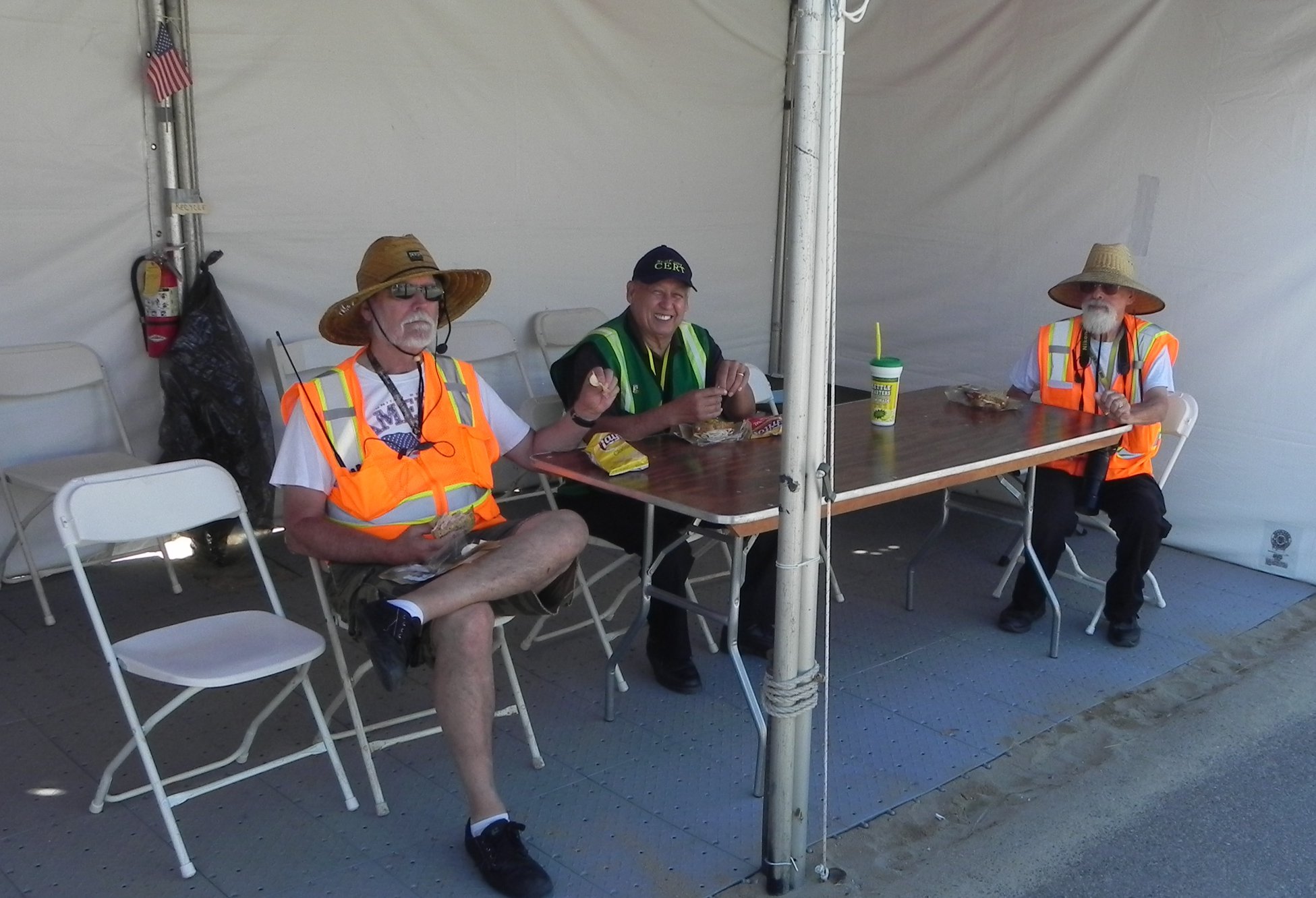 Some years prove a little more challenging than usual with the event taking place rain or shine. Pictured below during a rainstorm, the HB RACES members came prepared for the weather and were able to execute their duties without issue.